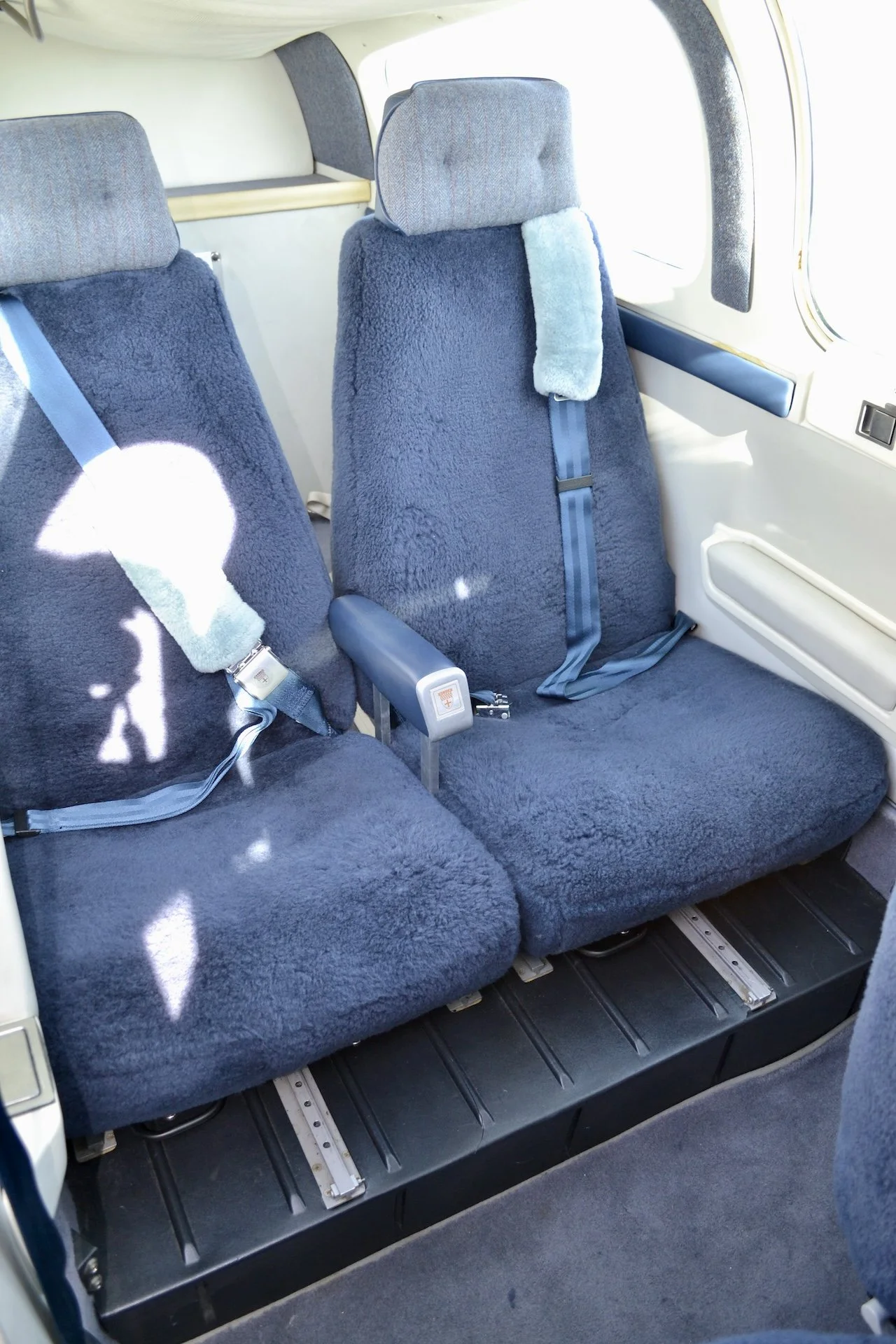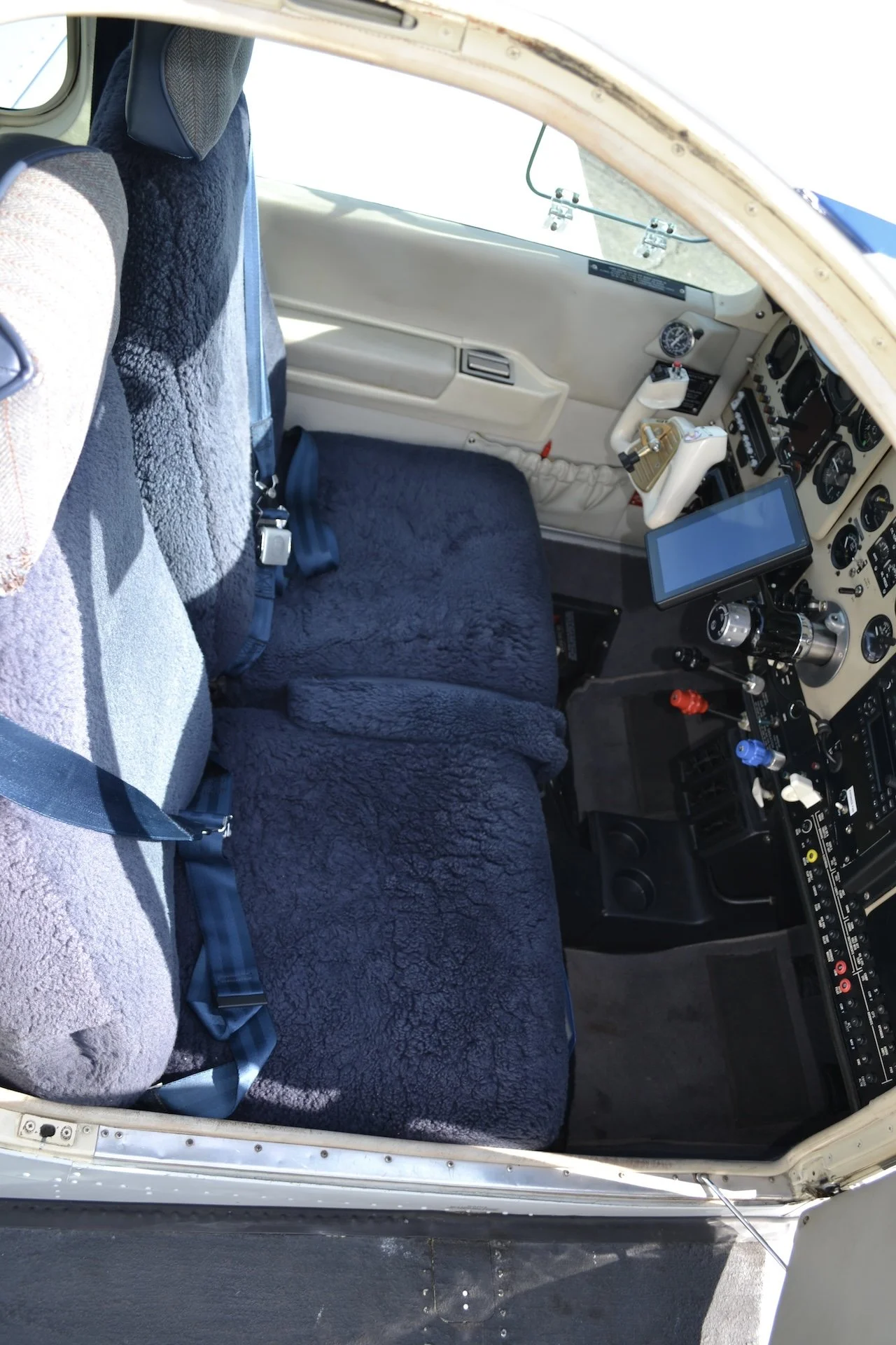 Blue Fabric Seats covered with Navy Blue Sheepskin Covers with Matching Carpet, Side-panels and Headliner. Deep Blue and Gray Accent Stripes. Excellent Condition.