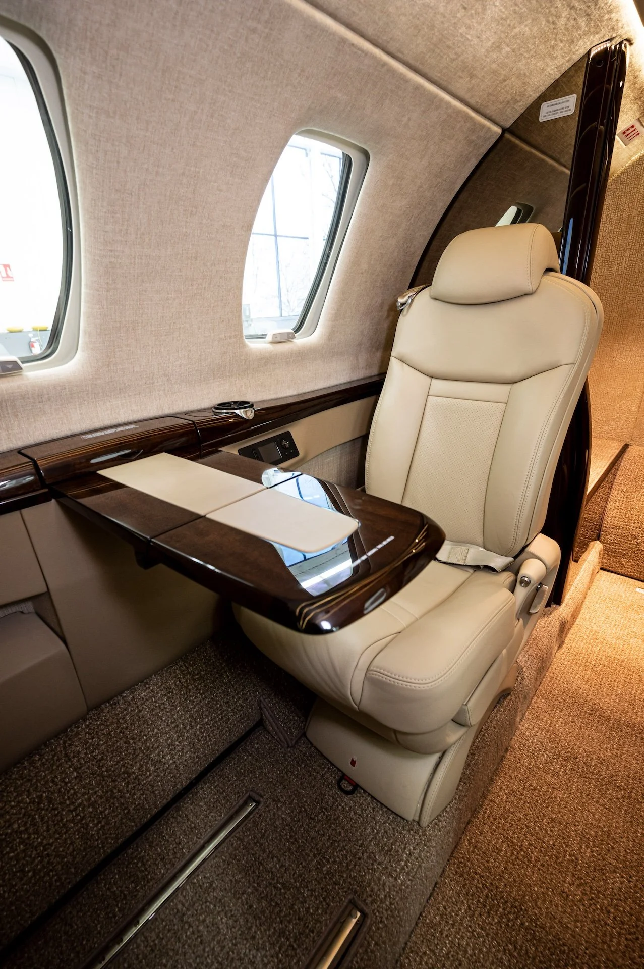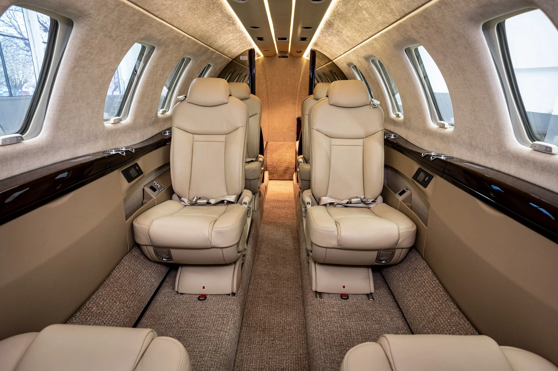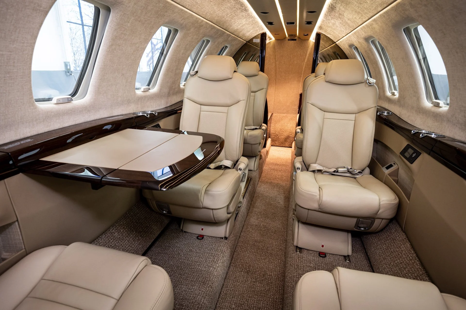 NINE PASSENGER SEATS INCLUDING TWO PLACE DIVAN AND BELTED LAV IN TAN LEATHER WITH MATCHING CARPET, SIDE PANELS AND HEADLINER.